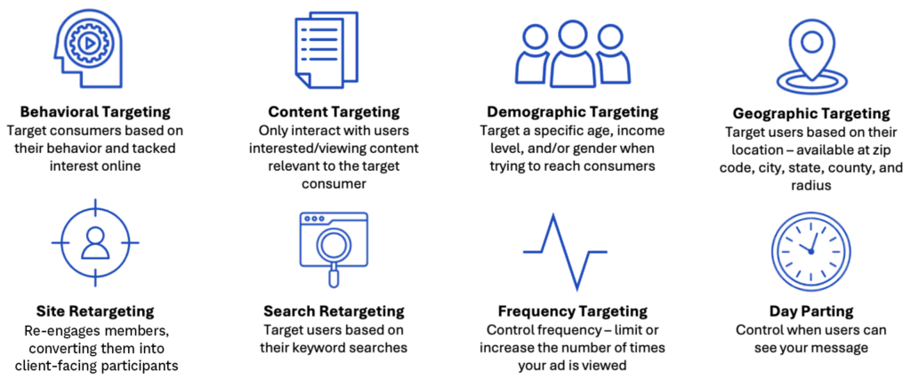 Targeted advertising via Programmatic Display, Geofencing and Native tactics require delivering a minimum of 10,000 impressions per month, to ensure an effective reach and frequency to your target audience.